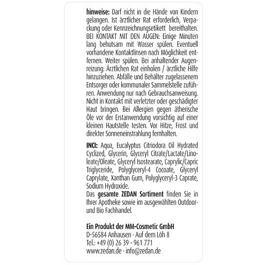 Inhaltsstoffe nach INCI: Aqua, Eucalyptus Citriodora Oil Hydrated Cyclized, Glycerin, Glyceryl Citrate/Lactate/Linoleate/Oleate, Glyceryl Isostearate, Caprylic/Capric Triglyceride, Polyglyceryl-4 Cocoate, Glyceryl Caprylate, Xanthan Gum, Polyglyceryl-3 Caprate, Sodium Hydroxide.